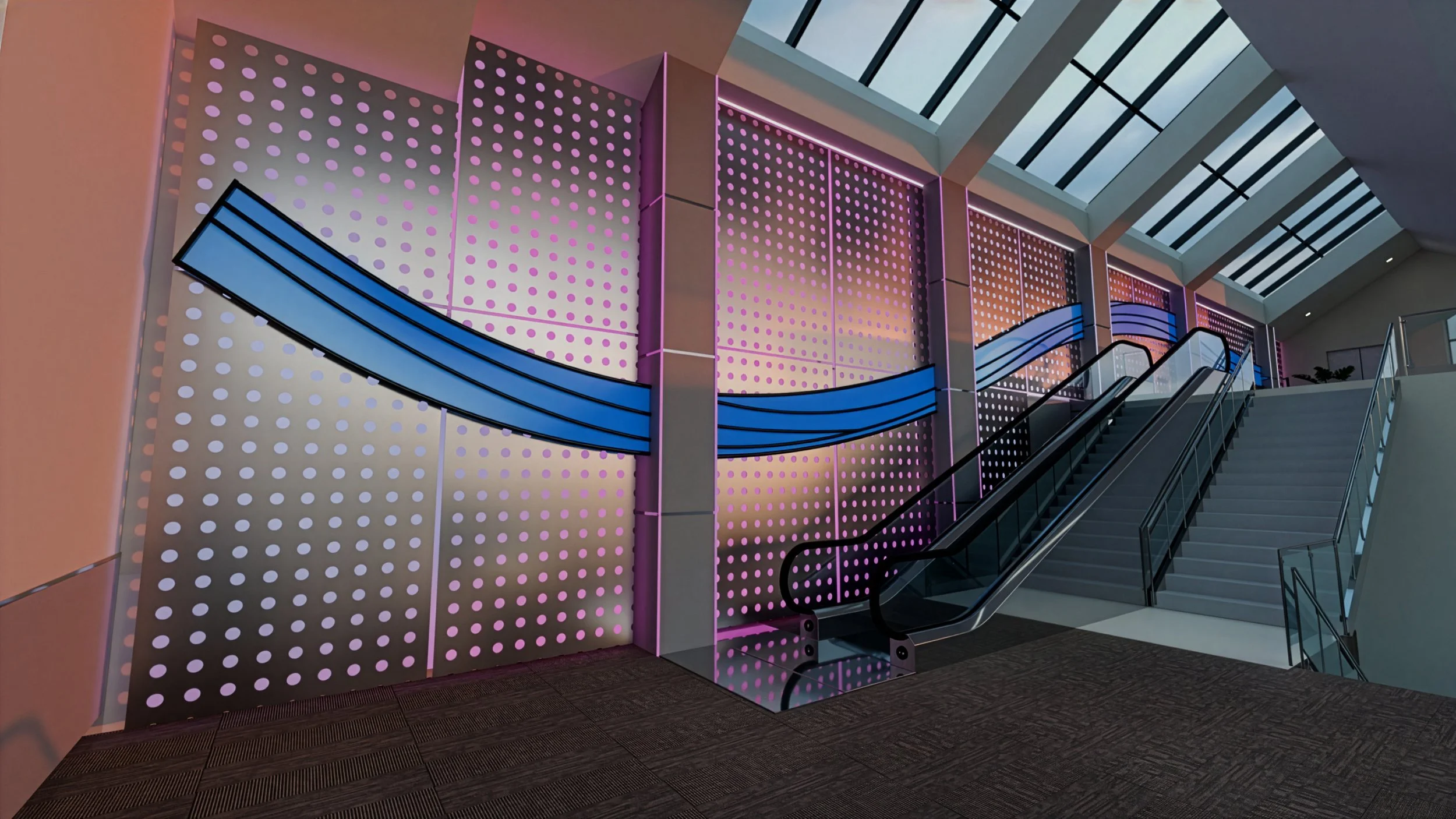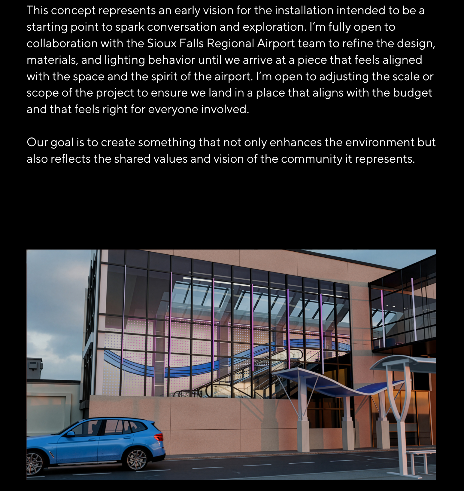 A sculptural wall of precision-cut perforated aluminum panels integrated with fully controllable RGB LED backlighting, designed to produce smooth gradients, flowing motion, and customizable lighting sequences. Flowing across the surface, a sculpted blue wave element sits atop the panels, its form inspired by the movement of water and the iconic falls of Sioux Falls. The wave contains a 2nd system of lighting allowing the wave to flow from left to right, while catching and reflecting the shifting light beneath it, creating a dynamic interplay of color and motion .